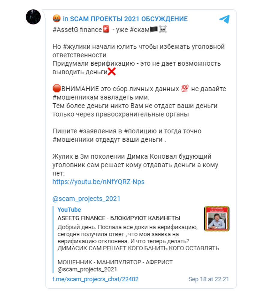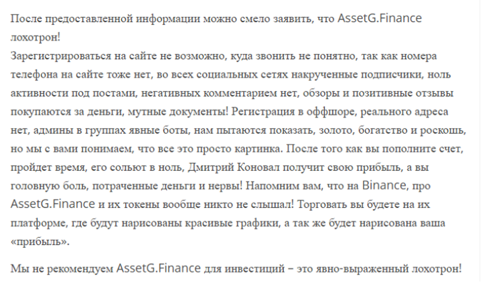 Теперь же Дмитрий Коновал организовал новый проект, с новым названием – «AssetG.Finance» но со старыми схемами.