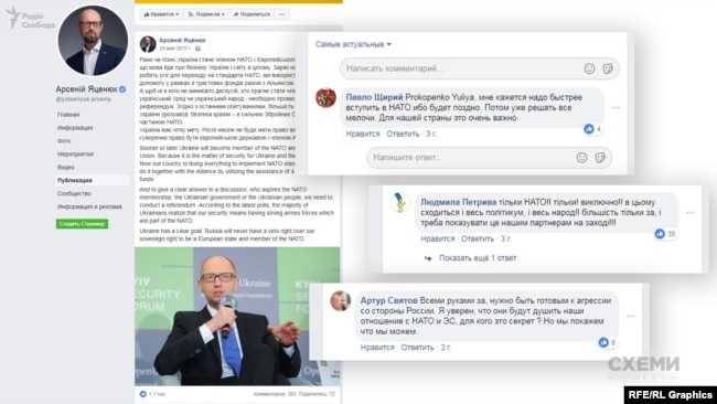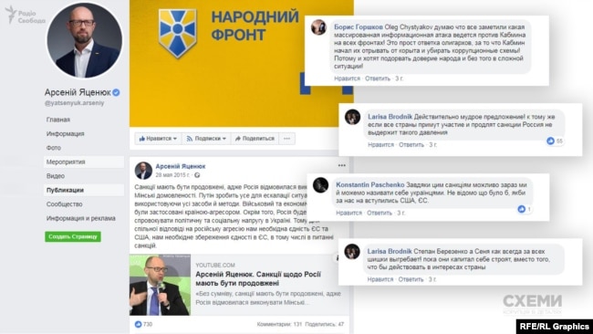 Цього разу «Схемам» вдалось не лише підтвердити факт використання підставних акаунтів, але й знайти документальне підтвердження –організованого характеру «народної любові» до ключових осіб у правлячій партії «Народний фронт» – Арсенія Яценюка та Миколи Мартиненка.