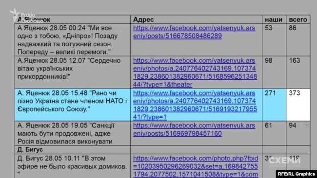У ньому детально описано, під якими постами про Арсенія Яценюка та його однопартійців несправжні юзери – тобто боти – залишали свої відгуки, чим захищали політиків від критики чи «зупиняли негатив».