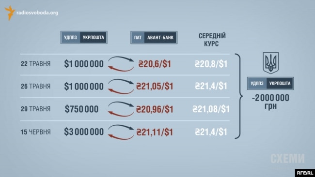 У травні-червні «Укрпошта» продала через «Авант-банк» майже шість мільйонів доларів США. Причому за курсом значно нижчим, ніж могла би. Зокрема: 22 травня 1 мільйон доларів був проданий за курсом 20,6 гривні за долар, хоча, згідно з інформацією Нацбанку, більшість угод на міжбанківському валютному ринку укладалися за середньозваженим курсом понад 20,8 гривні за долар. Таких операцій була ціла низка: маленькому банку продавали валюту за курсом нижче ринкового, допомагаючи йому на різниці курсу чималенько заробити.